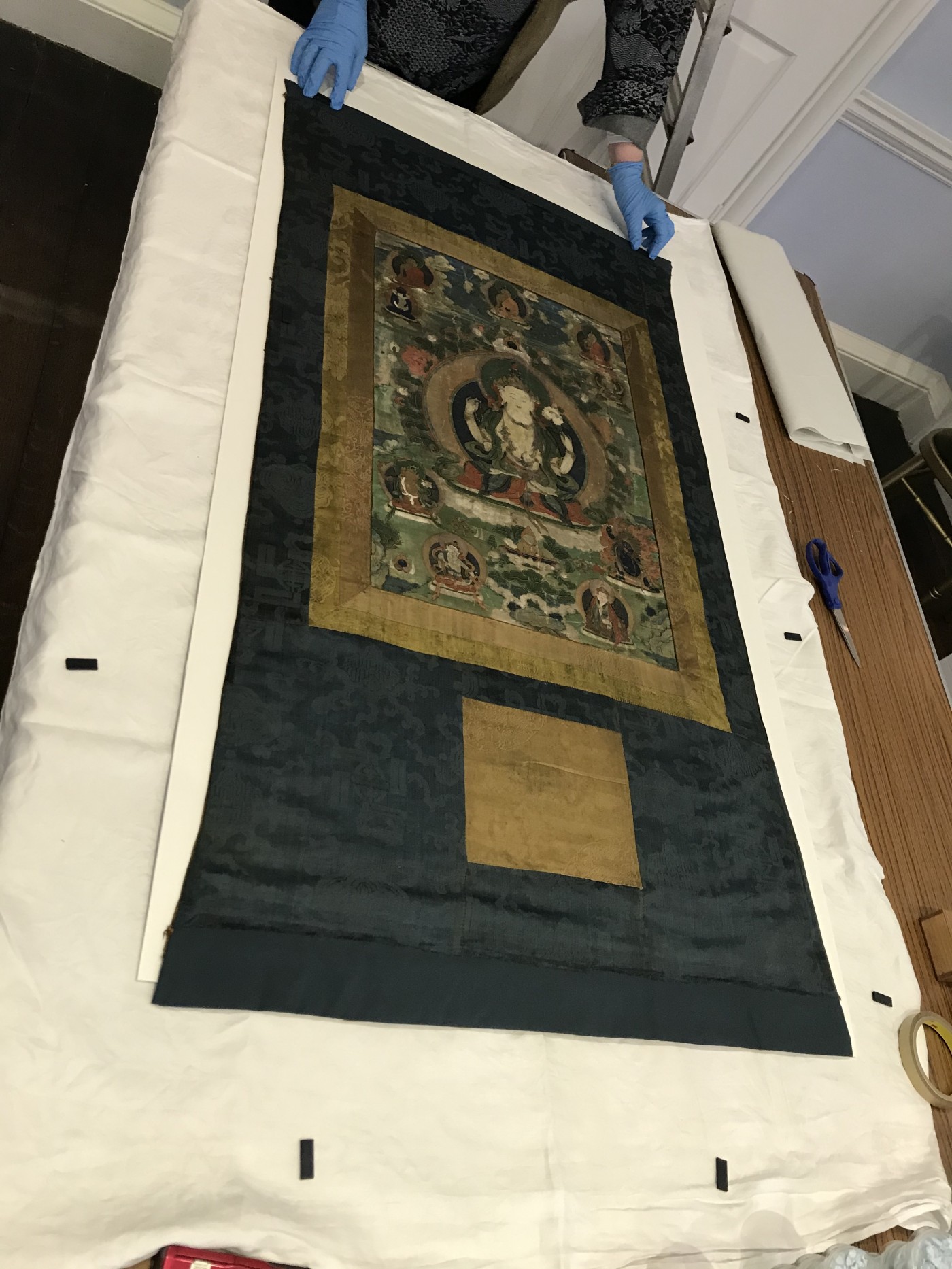 The mount method is also designed so that the thangka can easily be rotated in-house by Castle staff. Because the thangka are only attached using magnets, the backs of them can still be studied. Different textiles are used, and there are often inscriptions on the reverse of the central painted cotton panel. On the reverse of one the thangka a handprint left from the consecration ceremony can still be seen in red pigment.