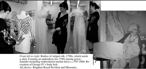 The exhibition, Dress for Excess, which opened in February 2011, celebrates the life of George IV and the Regency era through the dress of the period. The exhibition consists of period garments on open display across the Royal Pavilion with a separate room dedicated to George himself. To tell the story twenty-eight items were chosen. For display some of the items needed replica parts or in one case needed to be re-created completely. Through Amy de la Haye, Jennifer was recommended to me who took on the task with talent and enthusiasm.